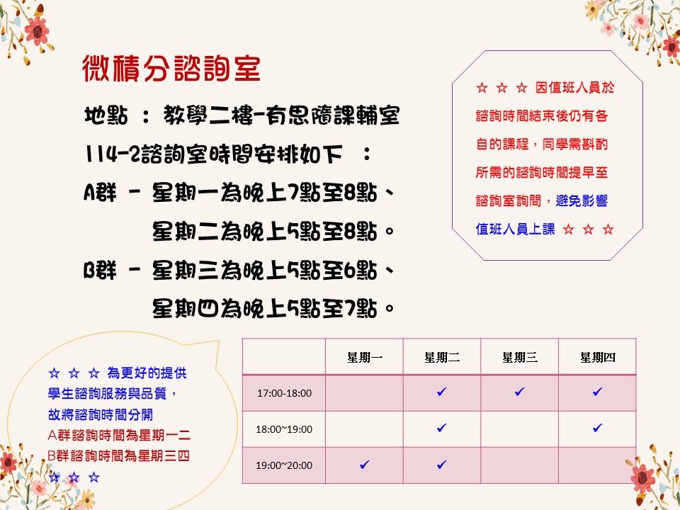 期中期末考週會將星期三四B群的諮詢時間移至星期一二與A群同時段。
