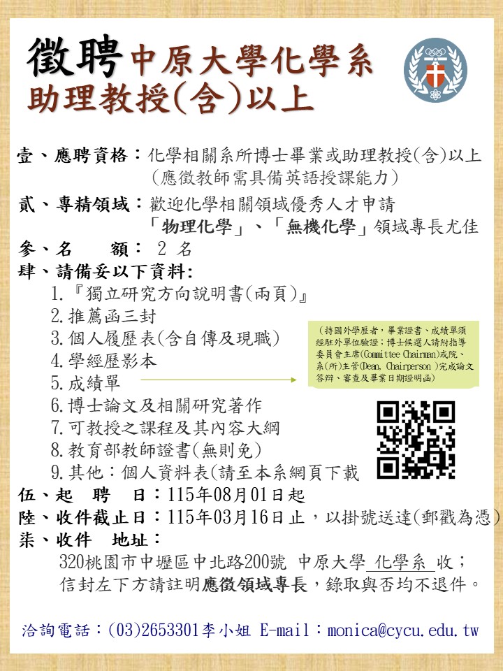 徵聘中原大學化學系助理教授(含)以上,收件至115年03月16日止,歡迎化學相關領域優秀人才申請,「物理化學」、「無機化學」領域專長尤佳。
