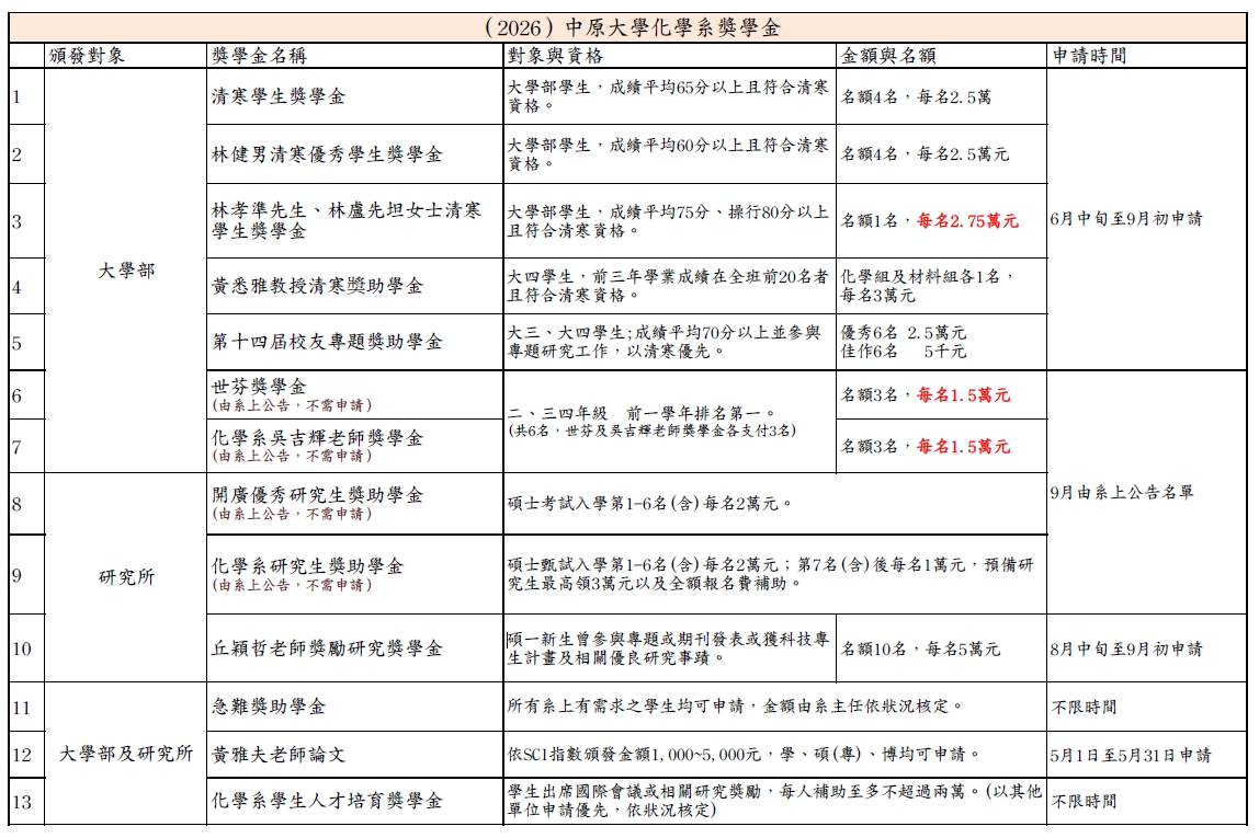 中原大學化學系「世芬獎學金」作業實施辦法(115)